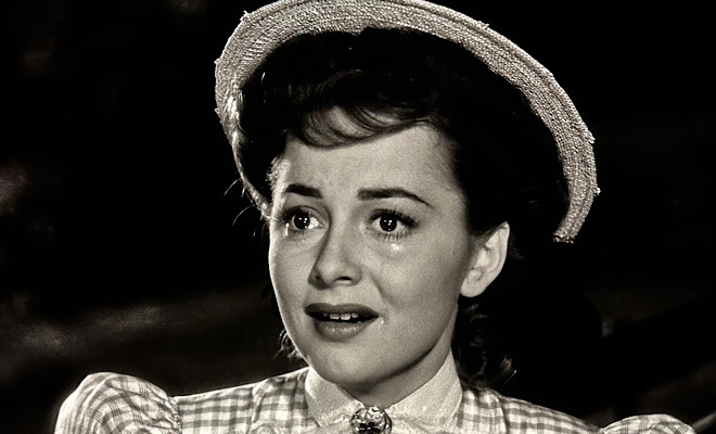 The nimble Cagney brings swagger, sensitivity, and a bit of sadistic glee to Biff and his dimensional portrayal fuels the film. Though at 41 he's a good 15 years older than both de Havilland and Hayworth (and looks it), his boundless energy and bouncy presence shaves years off his age. He and the luminous de Havilland work especially well together (they share a marvelous tender scene toward the end of the picture), but as hard as Westmore must have tried to make de Havilland seem plain when compared to Hayworth, he can't quite pull it off. Her innate radiance shines through, making it difficult to believe that Biff is "settling" for Amy. With apologies to Joseph L. Mankiewicz's priceless All About Eve script, most guys would give their eye teeth for that particular compromise!