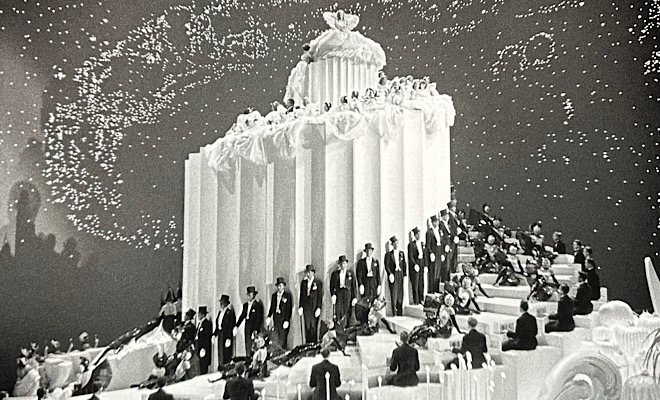 It's a shame The Great Ziegfeld concentrates so intently on stuffy biography, because the film really shines - and often dazzles - when the Follies-style production numbers unfold. Dance director Seymour Felix, who also won an Oscar, strives to emulate Busby Berkeley's synchronized choreography, but what the musical sequences lack in kaleidoscopic imagination, they make up for in opulence, the likes of which rarely have been equaled. "You Never Looked So Beautiful Before" spotlights some of the most outrageous costumes ever to grace the silver screen, but nothing can top the iconic treatment of Irving Berlin's "A Pretty Girl Is Like A Melody." Featured in the inaugural That's Entertainment! film, the number transforms a seemingly endless staircase into a gargantuan wedding cake speckled with live mannequins, tuxedo-clad chorus boys, exotic dancers, even opera singers, all of whom somehow navigate the treachery of the continually revolving set. A masterwork of ingenuity and execution, "A Pretty Girl" epitomizes MGM gloss.