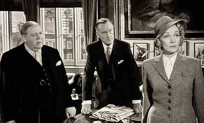 Power's astute, polished, and impassioned performance helped revive his flagging career, but sadly, Witness for the Prosecution would prove to be his final film. The swashbuckling matinee idol would die of a heart attack several months after shooting concluded at the tender age of 44 while working on the sword-and-sandal epic Solomon and Sheba. Dietrich also asserts herself well in arguably her most challenging screen role, acting with an emotional vigor she rarely displayed over the course of her long career. Always cool and aloof, Dietrich wisely employs those qualities early in the movie, casting an air of mystery over her pivotal character that makes it difficult to discern her motives or define her actions. She, too, hoped to nab an Oscar nomination for her work, but was unfortunately overlooked - most likely due to the mispronunciation of a single syllable. (I'd love to elaborate, but doing so would spoil a major plot point.)