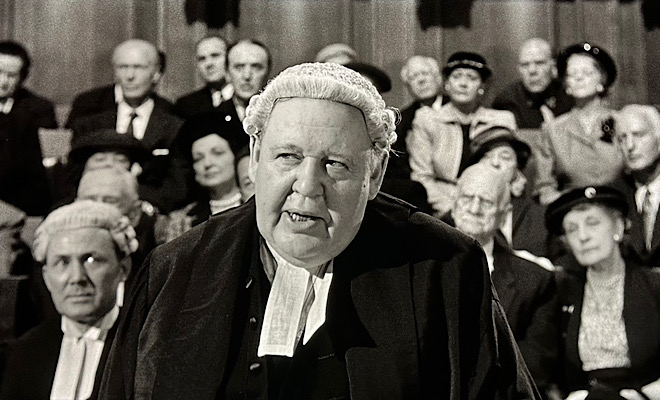 Sir Wilfrid (Laughton) is one of London's most esteemed and brilliant barristers, yet away from the courtroom he's a cantankerous curmudgeon who punctuates his dour attitude with withering sarcasm and disdain for regimentation and personal restraint. When we first meet him, he's returning home from the hospital in a weakened state after suffering a heart attack, accompanied by an overly attentive flibbertigibbet of a personal nurse, Miss Plimsoll (Lanchester). (The character was invented by Wilder and did not appear in the original Christie play.) Sir Wilfrid is under strict directives to rest and avoid stress, but much to the chagrin of the overprotective and ordered Miss Plimsoll, he can't resist the allure of a juicy murder case. And much to her horror, he forges ahead full throttle.
