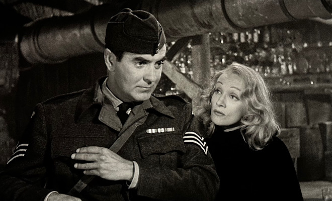 That case concerns Leonard Vole (Power), a charming, handsome war veteran, part-time inventor, and all-around ne'er-do-well, who's accused of bumping off a rich widow (Norma Varden) after it's revealed she bequeathed him a large sum of money. He ardently professes his innocence - and Sir Wilfrid believes him - but a mountain of circumstantial evidence points to his guilt. His only alibi is his emotionless wife Christine (Dietrich), a German expatriate who Leonard rescued during the waning days of World War II. So imagine everyone's surprise when Christine turns up as a surprise witness for the prosecution and provides damning evidence against Leonard, who can't believe his devoted wife has turned against him. Such a brazen betrayal shocks the courtroom, but it's only the opening salvo in what quickly becomes a highly dramatic and unpredictable case.
