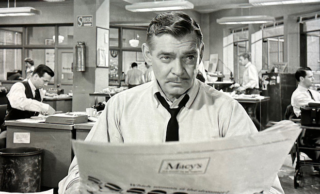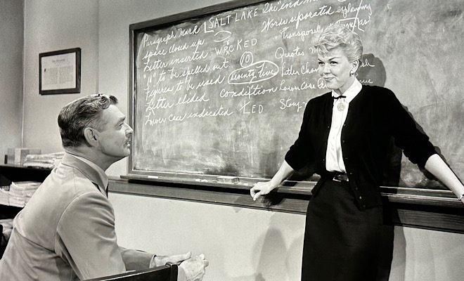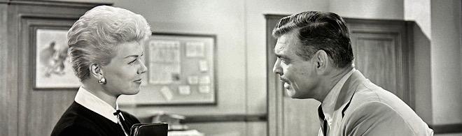 Journalism and romantic comedy make strange bedfellows, which may explain why Howard Hawks' His Girl Friday is such a delightful anomaly. Who knew pounding the typewriter and working the phones could be so sexy, but Cary Grant and Rosalind Russell turn the newsroom into a substitute for the bedroom, and their rapid-fire banter lofts Hawks' hilarious battle of the sexes into the classic realm. Teacher’s Pet, directed by George Seaton (The Country Girl, Miracle on 34th Street), tries its best to recreate the formula, but writers Fay and Michael Kanin can't replicate the crackling dialogue of Ben Hecht and Charles MacArthur, and their preoccupation with preachy messages douses any romantic sparks. They also fail to maximize the rich comic possibilities inherent in the casting of screen Casanova Clark Gable opposite the movies' eternal virgin Doris Day. Though well-suited to their roles, Gable and Day spend more time sniping than smooching and never create the steamy chemistry so vital to this type of film.
