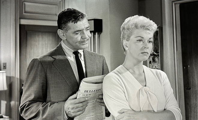 Part of the problem is the pair's 23-year age difference, but Day's prim nature also doesn't mesh well with Gable's machismo. The actor always worked better with more bawdy dames like Jean Harlow, Joan Crawford, and Ava Gardner, and the 57-year-old's prurient interest in Day makes him seem - for the first time - like a dirty old man. And though Day's character, Erica Stone, possesses far more dimension than the cardboard stereotypes she would almost exclusively portray after the premiere of Pillow Talk the very next year, she's definitely a preview of coming attractions.