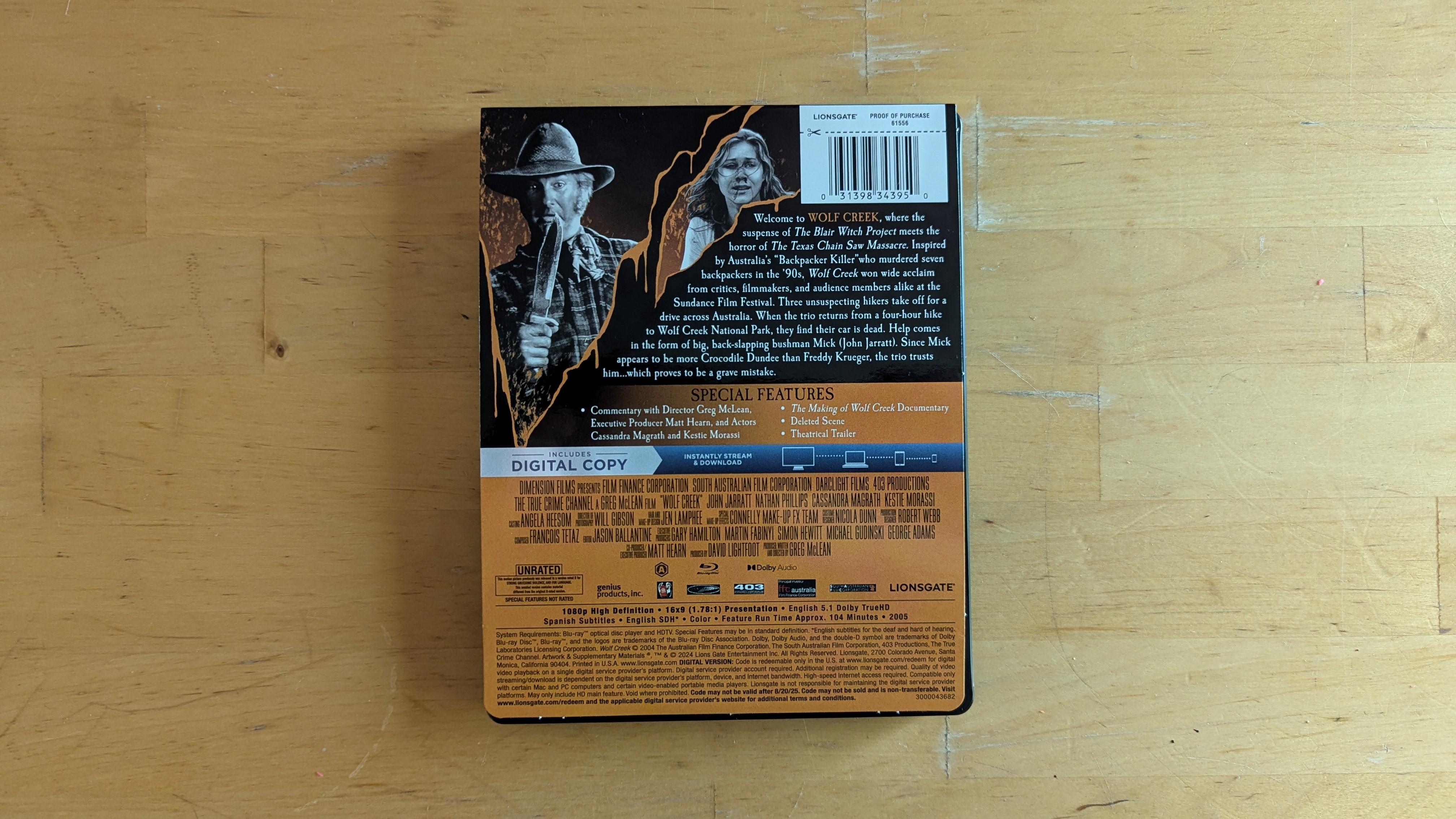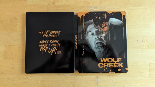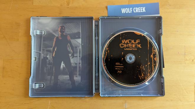 Lionsgate finally gives Wolf Creek a domestic Blu-ray release with a single-disc Blu-ray + Digital SteelBook. A Walmart-exclusive release as part of the Bloody Disgusting partnership, the film is pressed on a BD-50 disc (while only using about 32 gigs of that space) and housed in a horror-themed SteelBook featuring a black and orange motif with original artwork. Overall this is a pretty SteelBook, but I've got to be honest nothing can quite compare with that classic poster art of a girl in bloody clothing stranded on a desolate road in the middle of nowhere. Only the Unrated cut of the film is included.