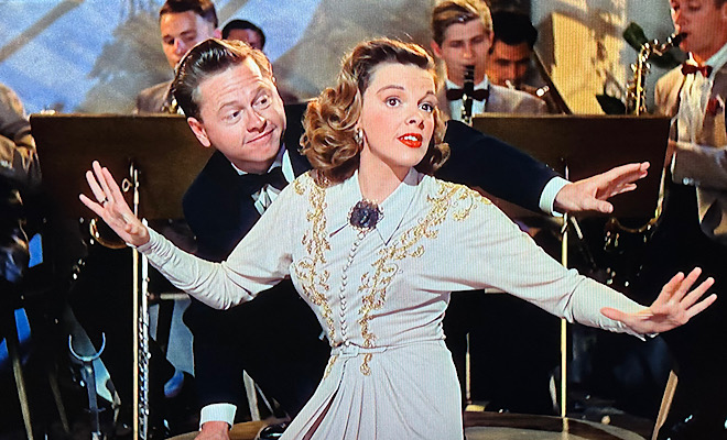 Not to be outdone, Garland first reunites with Rooney - five years after their final let's-put-on-a-show backyard musical - for a slick duet of the cleverly sarcastic "I Wish I Were in Love Again." The two stars enjoy a wonderful rapport, as Garland's class balances Rooney's clowning, and their mutual esteem is evident throughout. Preview audiences so loved the number, they demanded another Garland solo, and a few months later (and a few pounds heavier), Judy returned to the reassembled set to belt out a rip-roaring rendition of "Johnny One Note," a song perfectly suited to her powerful, vibrant voice.