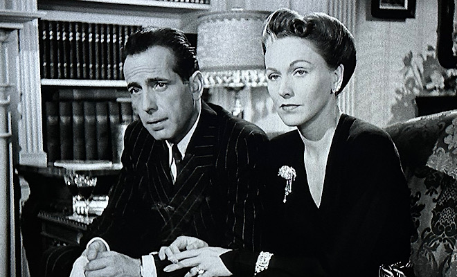 Thankfully, a strong cast is on hand to make the material seem better than it is. Bogart, who wears his trademark trench coat throughout much of the movie, proves you can go home again by filing a brooding, understated portrayal that seethes with malevolence. The screenplay doesn’t give him many quips, but he delivers the few he gets with his typical sardonic inflections. His chemistry with Smith, who would drive him to try and murder another screen wife (Barbara Stanwyck) in The Two Mrs. Carrolls a couple of years later, is tepid at best, but the dearth of passion serves the story well, making Richard’s actions seem even more disturbed.