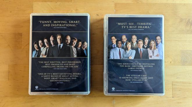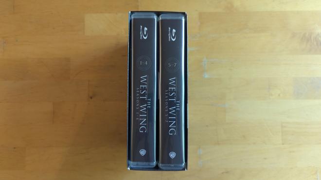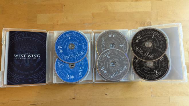 Elected to the office of 1080p, The West Wing: The Complete Series comes home to Blu-ray for the first time. All 156 episodes come home spread over 28 Region Free BD-50 discs. The discs are housed in two Epik Pak multi-disc cases, seasons 1-4 in one case, seasons 5-7 in the second. The cases are larger than a standard Blu-ray case by over an inch, so depending on your shelf setup, you’ll need to find alternate arrangements. The Epik Pak cases are housed in a thin paper slipcase that has a faux leather look with the silver presidential seal. Also included is a gatefolded booklet episode guide letting you know which disc had what episode and if there are bonus features or a commentary track present. Each disc loads to a static image main menu with standard navigation options allowing you to play all the episodes on disc, or choose which you’d like.