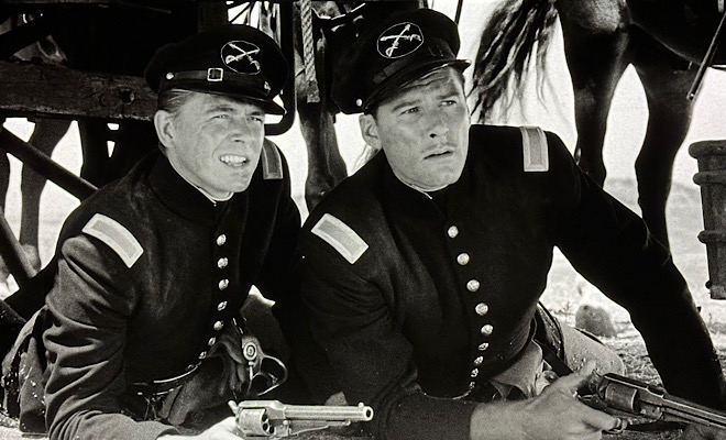 After The Sea Hawk, Flynn and Curtiz jumped ahead a few centuries and headed directly to the Old West. There's a lot going on in Santa Fe Trail, but little of it has anything to do with the titular route between Mexico and Missouri. A bastardization of history but an utterly captivating film, Santa Fe Trail follows the exploits of such lofty historical figures as Jeb Stuart (Flynn), George Armstrong Custer (Ronald Reagan), General Robert E. Lee (Moroni Olsen), and notorious abolitionist John Brown (Raymond Massey), among others, in the years directly preceding the Civil War. The screenplay leads us to believe all the heroes were classmates at West Point and served together in the military afterwards, but nothing could be further from the truth. In fact, there's practically no truth in this brazenly inaccurate film that never lets history get in the way of its fun.