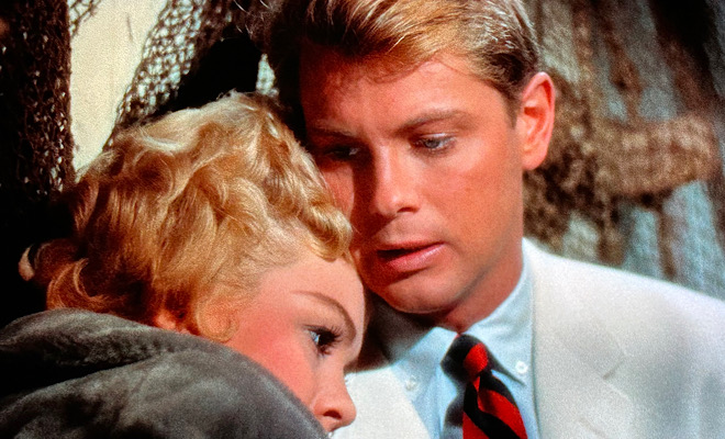 A brand new HD master struck from a 4K scan of the original camera negative yields a very pleasing 1080p/AVC MPEG-4 transfer that faithfully honors the cinematography of two-time Oscar-winner Harry Stradling Sr. The original grain structure remains intact and proffers a vibrant film-like image that features excellent clarity and contrast and a fair amount of depth. A Summer Place was mounted in the era of single-strip Technicolor, so the hues aren't quite as sumptuous as those produced by the format's three-strip cousin, but they still exhibit palpable luster. Red is an essential and dominant color, and Dee's lipstick, Donahue's sweater, and the red accent lighting are all bold and lush. The crystal azure sky and Donahue's baby blues are also nicely rendered, and yellows, greens, and lavenders make statements as well.
