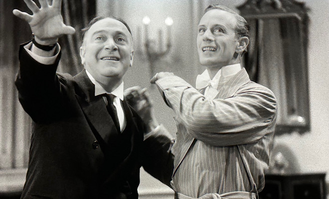 The screenplay by Casey Robinson, who nabbed an Oscar nod for Errol Flynn's Captain Blood a couple of years before and would go on to pen such stellar Davis weepies as Dark Victory, The Old Maid, All This and Heaven Too, and Now, Voyager, packs his script with an array of manic situations and clever one-liners. The opening scene, which has Basil and Joyce hurling under-their-breath insults at each other during a performance of Romeo and Juliet, is especially amusing, and much of the banter between Basil and his faithful valet Digges (Eric Blore) is priceless. The whimsical Blore, who specialized in playing veddy-veddy British manservants with a decided daffy demeanor in countless Golden Age movies (most notably in a string of Fred Astaire-Ginger Rogers musicals), totally steals the show with his sublimely ridiculous performance.