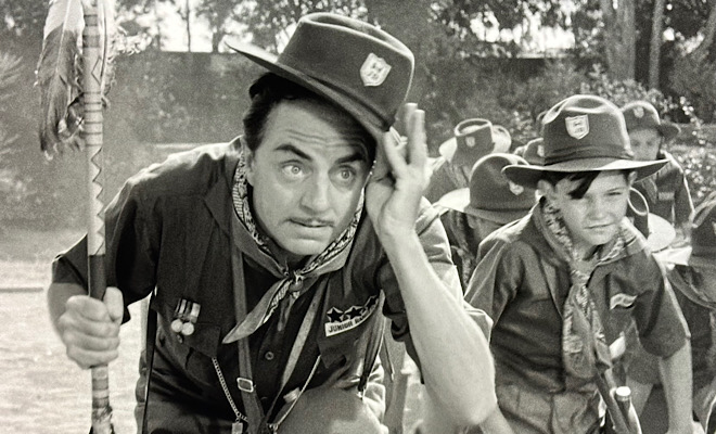 Powell grabs the lion's share of laughs with a role that's far more interesting and demonstrative than Loy's. He plays the oily, unctuous Larry to perfection, albeit briefly, and seems to relish a few slapstick situations, the most notable of which has him donning a Boy Scout uniform and leading a troop of young charges (that includes Our Gang's Carl "Alfalfa" Switzer and a seven-year-old Robert Blake) on a hike. The sequence runs a bit long and doesn't really have much to do with the main story arc, but it's fun to see Powell's pratfalls and priceless facial expressions as he weathers a barrage of hazards along the way. Though Powell is best known for his urbane manner and polished appearance, he doesn't seem to mind getting dirty, even when Loy, in a fit of pique, dumps a plate of scrambled eggs over his head.