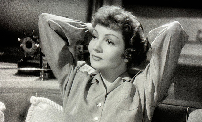 Director Mark Sandrich, who helmed five Astaire-Rogers musicals and whose next assignment would be the all-time seasonal classic Holiday Inn, constructs a couple of memorable comic scenes, the most hilarious of which chronicles Lydia's futile attempts to make coffee on the lower deck of Jim's fishing boat during a raging storm. The water-logged floor and violent boat movements wreak havoc on poor Lydia, who gets tossed around like a ragdoll and repeatedly slips and falls while trying to perform the simplest tasks. Colbert channels her inner Buster Keaton and proves she can be a highly capable physical comedienne in a slapstick scene that pre-dates Katharine Hepburn's similar - and more famous - waffle-making debacle in Woman of the Year the following year.