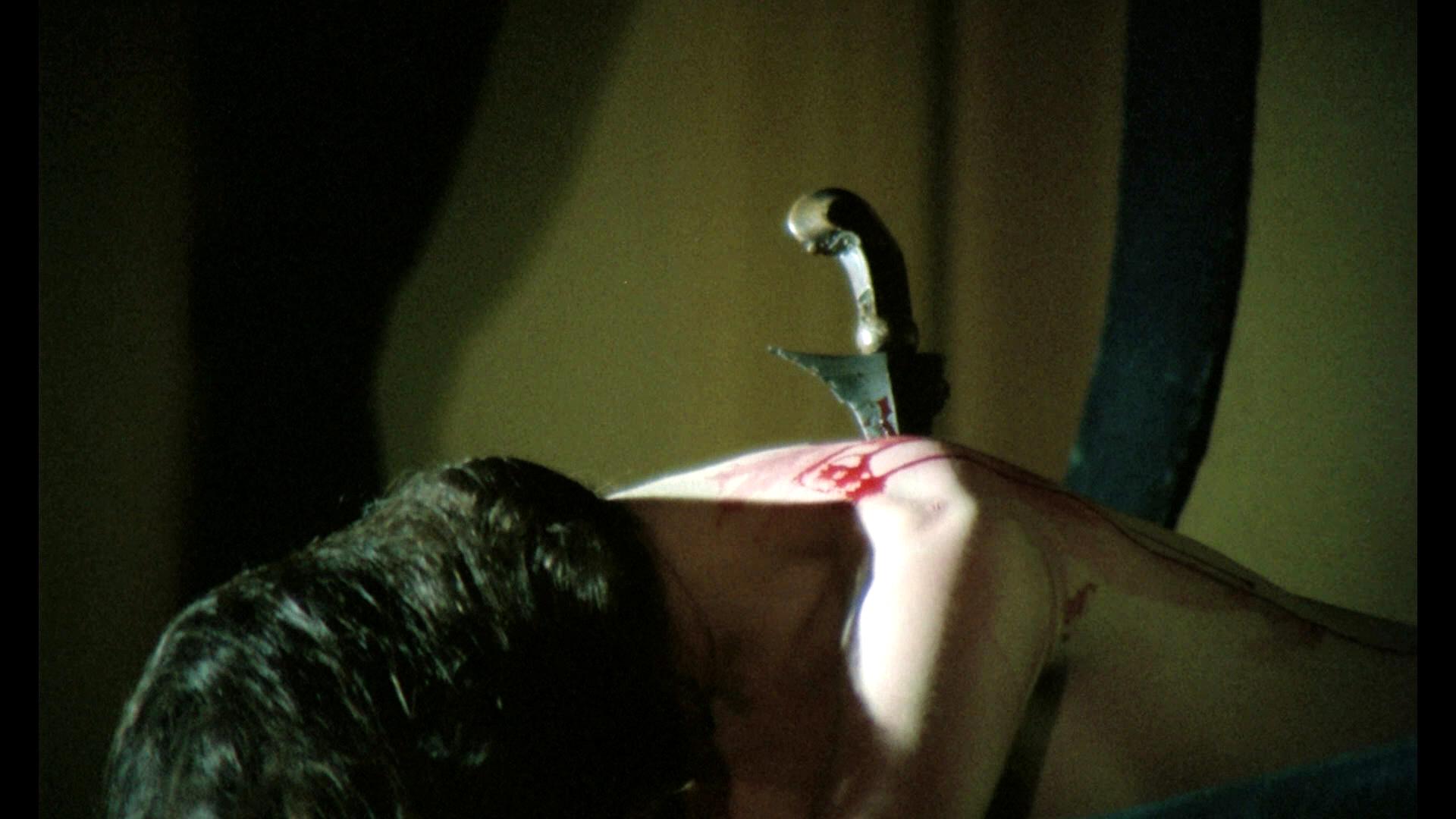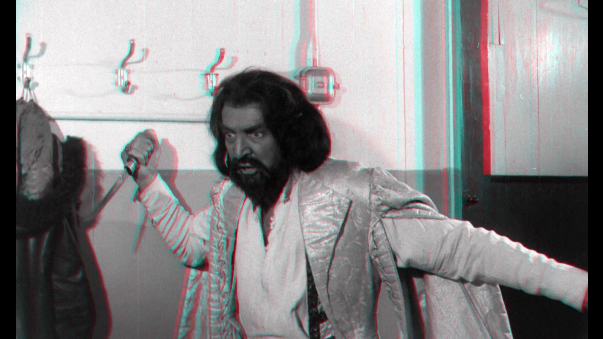 Now, this release delivers the black-and-white sequence properly showcased in stereographic 3D or anaglyph (you can still watch it flat if you’re weird) into the main feature. To my understanding, that climactic reveal sequence was shot on dual-strip 3D with faulty gear (or the gear was fine but improperly used, I’ve read differing accounts of that), resulting in a misaligned image that was a big headache to watch or, at best, just not very effective. I remember the sequence on the old Redemption disc triggering a migraine when I watched it years ago (which is why I never bought it). This round, the wizards at 3-D Film Archive got to go in and realign the sequence, and it’s very effective. It’s still a bizarre gimmick of a scene, but now if you watch it on your enabled TV or projector or if you roll in anaglyph, it at least looks good, the gray scale is strong and healthy for the sequence, and there’s some excellent depth to enjoy. If you like knives popping out at you, there are a couple of fun shots! And nudity too! There is 3-D nudity. Horror, boobs, 3-D, all the bases are covered.