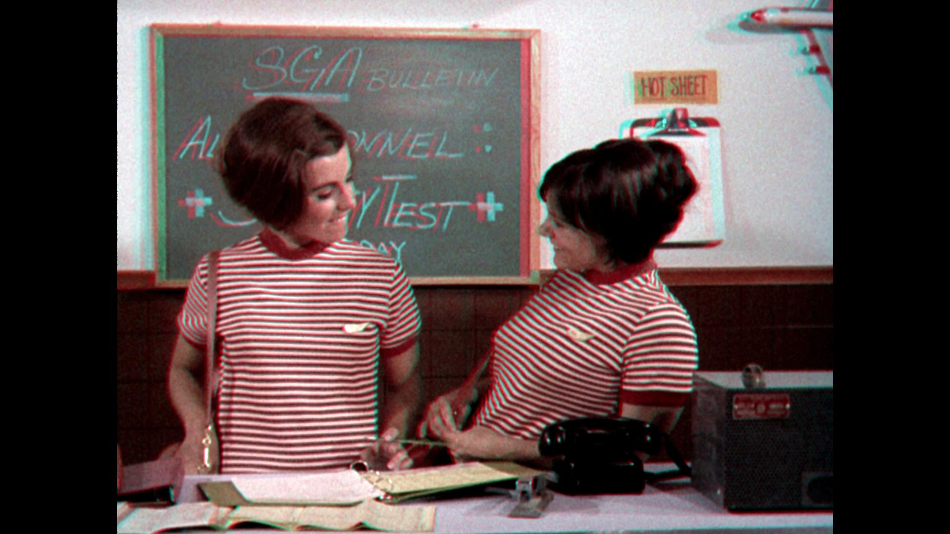 Taxiing for a return flight on Physical Media, The Stewardesses returns to physical media with a new two-disc Blu-ray from Kino Cult and 3-D Film Archive. The stereographic and anaglyphic 3D presentations (as well as 2D, but who the hell wants that?) are pressed on a Region Free BD50 disc with another Region Free BD50 disc serving up the new and archival extra features - also presented in stereographic and anaglyphic 3D. A pair of Kino Cult and 3-D Film Archive branded anaglyph 3D glasses is included. The insert artwork is reversible, and the set is completed with a slipcover. Each disc loads to a static image main menu.