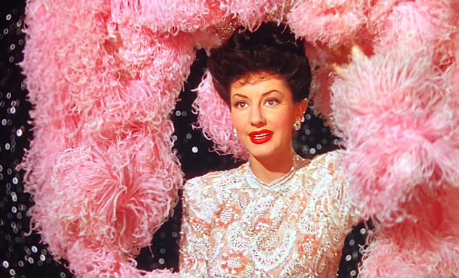 Like most MGM and Minnelli-directed musicals of the 1940s, bold, brilliant color bathes Ziegfeld Follies, and the 1080p/AVC MPEG-4 transfer from Warner Archive (which looks as if it underwent a glorious restoration prior to its high-def release) beautifully and faithfully honors the lush Technicolor photography of 13-time Oscar nominee George Folsey and two-time Oscar winner Charles Rosher (who would take home the coveted prize the same year for The Yearling). Gorgeous reds assault the senses throughout, but an array of stunning blue shades impress as well. Lucille Bremer’s bright yellow dress in the early portion of the “Limehouse Blues” number dazzles the eye, as do the deep pinks in the opening ensemble number, as evidenced by Virginia O'Brien's outlandish outfit below..