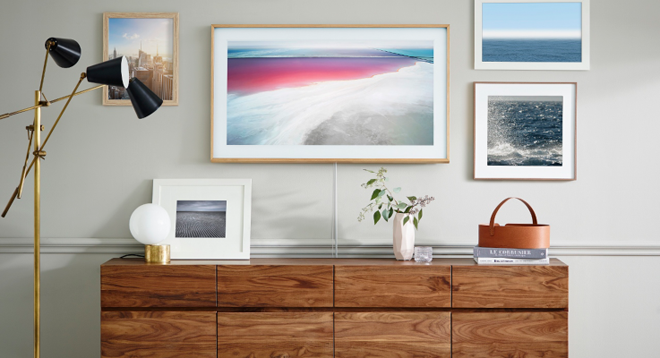 Emphasizing premium design, The Frame is a display designed to look like a picture frame hanging on a user's wall when not in use as a TV. When the unit is placed in "Art Mode," the screen displays custom-designed digital art pieces instead of fading to black like a traditional television. Customers can choose from 100 art pieces in 10 different categories --including landscape, architecture, wildlife, action, drawing, and more. Likewise, The Frame features several options for art layouts and colors, along with customizable accessories like interchangeable bezels and an optional Studio Stand. In addition, the display uses Samsung's new Invisible Connection and No Gap Wall-mount, allowing versatile mounting options without unsightly cables or wires.
